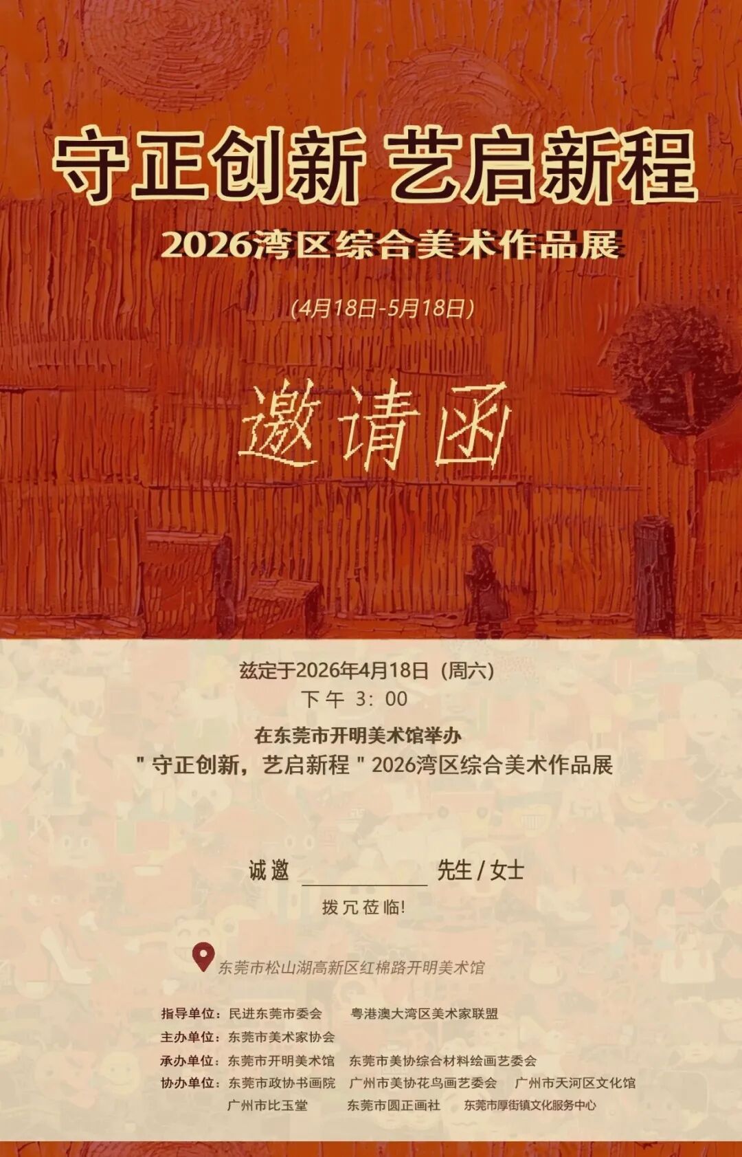 “守正创新•艺启新程——2026湾区综合美术作品展”将于四月十八号下午三点在东莞市松山湖开明美术馆启幕。本次展览汇聚粤港澳大湾区80多位优秀艺术家精心创作的主题性当代美术作品,涵盖国画、油画、水彩、漆画及综合材料等多种形式。作品既坚守传统笔墨底蕴,展现湾区人文山水之美;又立足时代大胆创新,描绘大湾区建设发展的蓬勃气象,尽显传承与创新交融的艺术风采。