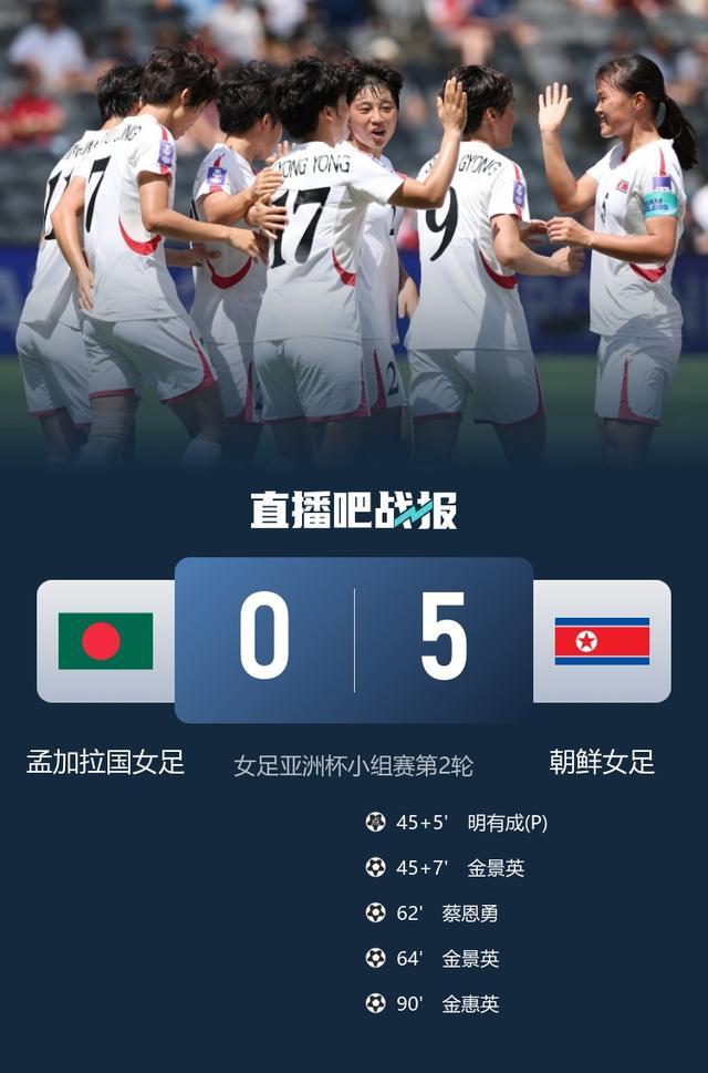 直播吧3月6日讯 北京时间3月6日10点,女足亚洲杯小组赛B组第二轮,孟加拉国对阵朝鲜。上半场,金景英和韩金洪先后破门但都被吹掉,金景英头球击中横梁。洪成玉补时造点,明有成点球命中,金景英扩大比分。下半场,蔡恩勇和金景英各进一球,金惠英替补建功。最终朝鲜女足5-0孟加拉国女足。本场比赛过后,朝鲜女足2战全胜积6分暂列小组第一,最后一轮将对阵中国女足,孟加拉国女足两战全负暂列小组第四。