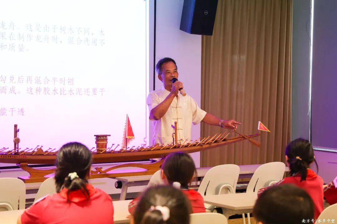 冯师傅用接地气的话语,从一块木头怎么变成一艘龙舟,到中堂龙舟为什么能划到今天;从岭南水乡的竞渡习俗,到“同舟共济”这四个字背后的故事……一件件娓娓道来,孩子们在故事中感受龙舟文化的深厚底蕴,听得入了神。